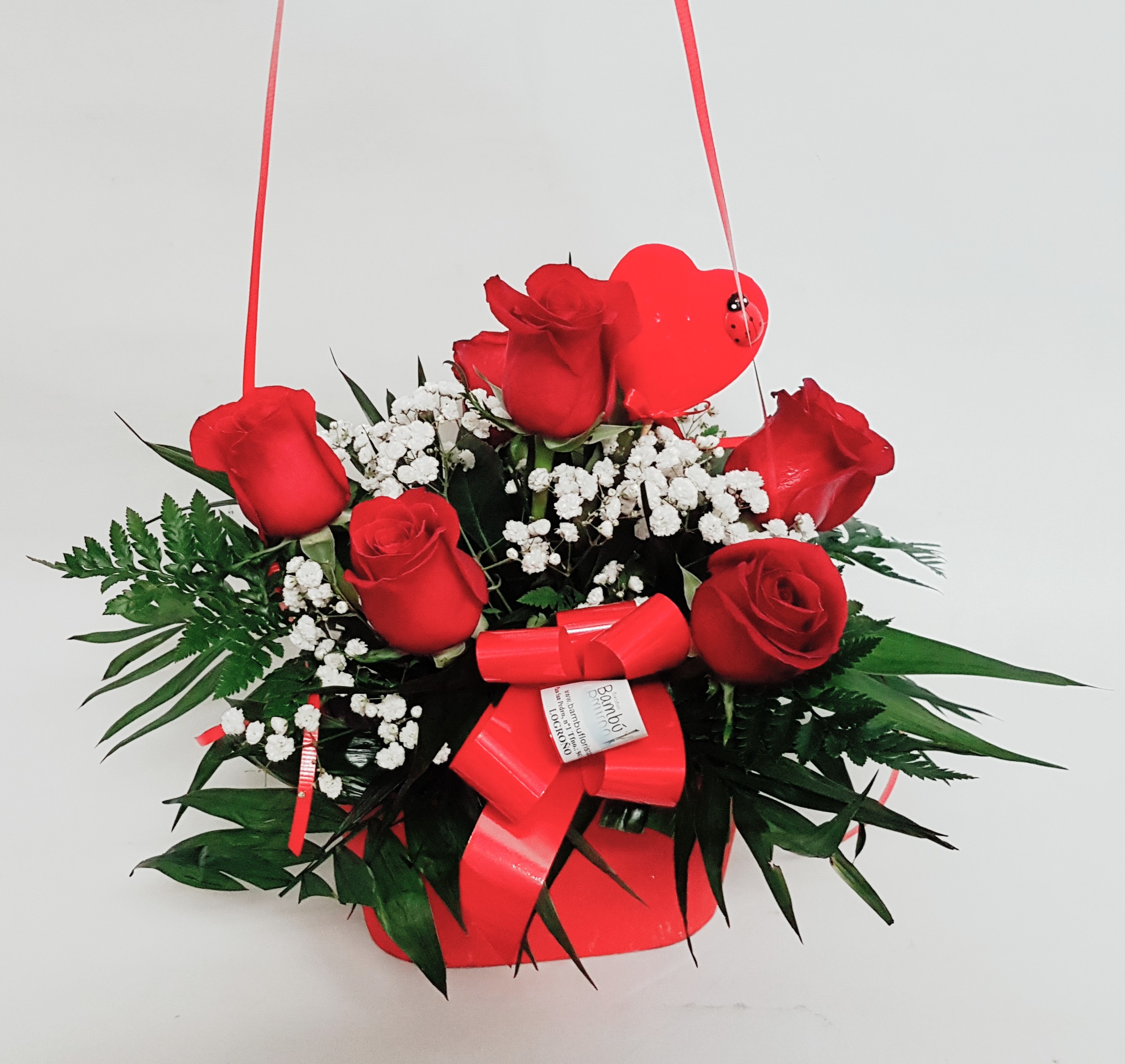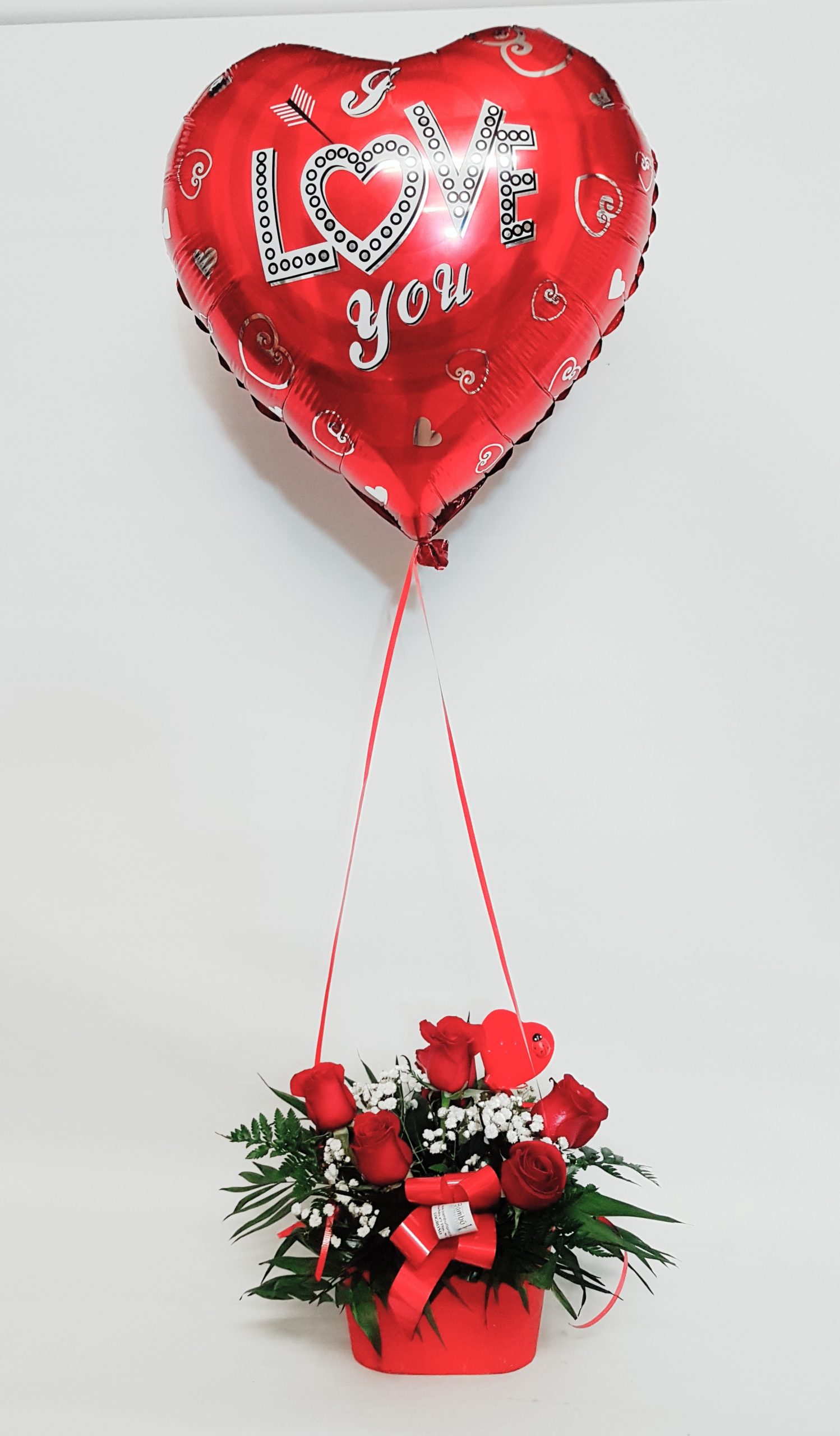Este arreglo esta compuesto por un centro floral (de 6 rosas rojas con verdes decorativos y Paniculata) y un globo tipo foil de 18″- 46 cm. (metalizado hinchado con helio).
